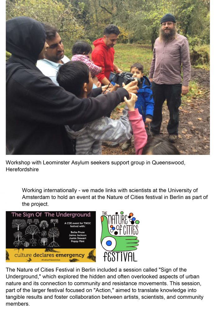 The Sign of the Underground is a New Leaf Sustainable Development Ltd commission for Arts Council England funded nature based visual art program across the West Midlands for nine artists, creating visual Biophilic (love of nature) artworks, co-production relational workshops and exhibitions. Commissioned artists have created artwork symbols and worked with communities to navigate underground and underwater tendrils connecting people and species, the rural and urban. Working with science partners including the society for the protection of underground networks, to create content for workshops and exhibition events have taken place with young people & vulnerable adults in: