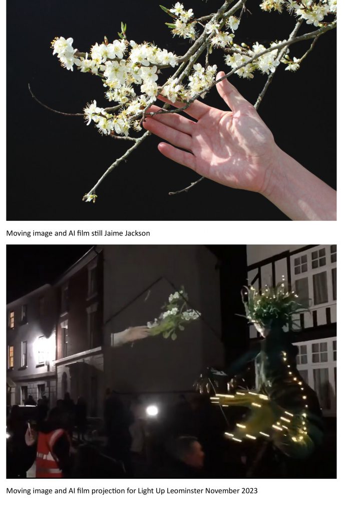 An AI Machine Learning moving image work from an archive created in response to the ecological crisis by the artist Jaime Jackson with over 300 people at the National Trust’s Brockhampton Estate Orchards Herefordshire. Part of Salt Road’s We Foragers Unquiet Arts Council England funded program. Jaime invited people from Birmingham and National Trust visitors to imagine they were bees pollinating the orchard’s fruit blossoms in April and May 2023.